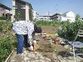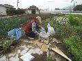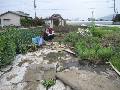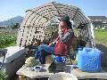 近所のおばあさんが、ソラマメとジャガイモ、エンドウを植えています。収穫を待ちます。ここでゴムマットを切り刻み、ひもで結んでいます。ここに第2休憩所を作っています。