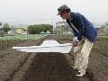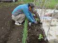 エダマメ 今年は早めの種まきです。徳用袋1個を使い切って、3列ができました。双葉をカラスが食べますから、不織布をかけなければなりません。不織布は軽いのでパイプを乗せて、金具で固定しました。2週間後に二回目の種まきをしました。