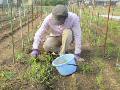 インゲン ツルナシインゲンです。畝が3列ありますので、畝ごとに時期をずらして種まきします。草取りをしながら土寄せをしています。