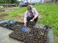 マリーゴールド テントの中でこつこつとポットに移植しました。4月28日に終了。完成した8ケースは北Eへ移動。