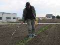 サトイモ 土の中が暖かいだろうと考え、昨年の親イモを植付けました。大きなイモも使うので、溝掘りが大変でした。溝をやめて、2列だけ植え穴を掘って植付けました。4列になりました。 2月11日、12日植付け
