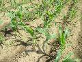 トウモロコシ ここには4列の畝があります。3列の畝に種まきしました。畝1列は長男の嫁の場所です。嫁も種まきに挑戦しました。5月中旬に肥料まいて土寄せをしました。全部で9列育っています。 @4月24日種まき A4月27日種まき