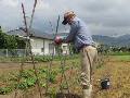 ナス 畝7列に長ナスを定植しました。畝幅80cmで苗の間隔は60cmです。計算では84株ですが、2株抜けていました。これからの作業は、ピーマンと同じです。4月4日、4月28日に肥料。5月6日支柱完了。5月11日ひもかけ完了。5月21日草取り・肥料まき・脇芽切りが終了。