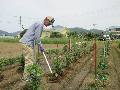 エダマメ 畝1列の半分を利用して、3列の種まきをしました。カラスとハトが食べるので、不織布を張りました。エダマメは孫が喜んで食べますから、今年は時期をずらしてたくさん植えます。時期をずらしたので、不織布を連続で使用しています。5月に入り、土寄せをしています。