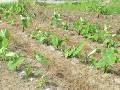 サトイモ 土の中が暖かいだろうと考え、昨年の親イモを植付けました。4列になりました。そろそろ雑草の芽が出ています。3月25日に除草剤をかけました。スギナ対策です。4月下旬に少しずつ新芽が出始めました。6月上旬に肥料。耕運機で溝を耕し、肥料をまいて土寄せをしました。 2月11日、12日植付け