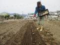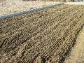 ジャガイモ 30cm間隔で10キロのジャガを植え付けました。畝の幅は60cmで、7列になりました。耕運機で耕してジャガを並べ、その間に牛ふんと肥料をまきました。 2月18日植付け