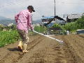 ニンジン 耕して畝作りをしながら、種まきをしました。幅110cmの畝に3列の種まきです。