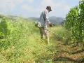2列のサツマイモの畝の間に、雑草が目立つようになりました。5月11日に除草剤をかけました。6月3日に草取りをしました。