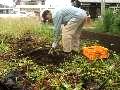 テーブルに花苗・土を入れたケース・ポットのケースを並べて、いよいよ花の移植作業です。