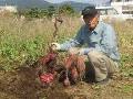8月9日に肥料をまきました。9月3日に草取りをして、肥料をまきました。9月中旬には株周辺の土が盛り上がってきました。順調です。10月6日に肥料をまきました。10月15日に1株を試し掘りしました。まだ小さくて、これからも大きくなるようです。