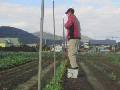 畝1列に1列の種まきです。11月上旬に発芽しました。11月15日に肥料。12月12日に支柱を立てて、ネットを張りました。スナップの生長と収穫は、エンドウよりも早いのです。