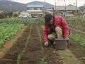 畝が1列空いていましたので、整地して2列の種まきです。1列に1袋の種で済みました。しかし雨が全く降らないので、発芽しません。11月中旬に発芽しました。12月13日に草取りをしました。12月17日に肥料をまきました。