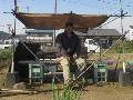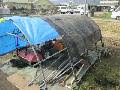 3月9日にハウスが完成したので、ブルーシートをかけました。ここに耕運機・草刈り機・噴霧器・ガソリンを保管しました。さらに隣にはシートを利用した道具置場を作りました。4月2日に耕運機を修理に出しました。テントのシートを交換しました。