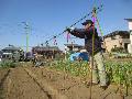 4月5日に東側畝にゴーヤ用のパイプを18本立て、緑のパイプで連結しました。4月10日にネットを張りました、