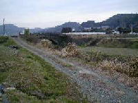 西南戦争当時のままの高瀬往還は、車はほとんど通りません。農道として利用されています。この道の先に豊岡の眼鏡橋が見えてきます。橋を渡れば、いよいよ田原坂です。写真の右方向に田原坂があります。