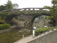 玉名市を流れる大きな菊池川に沿って、裏川があります。町並みは、上町から下町にいたる本通り筋があり、人工の川である裏川から直接荷物の上げ下ろしができるようになっていました。裏川にかけられたこの眼鏡橋は、県指定の史跡になっています。当時の町の玄関として、象徴的な存在でした。橋は、アーチの径(スパン)が6.7mある二重橋で、長さは19mあります。基礎からアーチ頂上までの高さは3.3mあります。江戸時代末期の1848年、高瀬町奉行高瀬寿平らによって造られました。