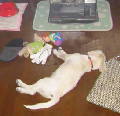 この犬は、ビーグルの雑種ということです。特徴は耳が垂れて、背中に茶色の毛が生えています。平成15年10月5日生まれのメスで、連れてきた当時は体重3.3kgでした。あまり吠えませんが、足が太くて力持ちです。最近体重を測ったところ、7kgになっていましたので、一ヶ月で二倍の重さになりました。予防接種や投薬も終わり、これまで体調をくずしたことはありません。