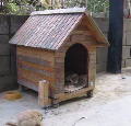 写真の犬小屋は、友人からいただきました。私たちも共働きですので、出勤後は小屋につなぎます。小屋を改造して、左側に鎖をかける木の棒を取り付けました。これは散歩用のひもでも、すぐにかけられるようにするためです。餌はドッグフード(幼犬用)やご飯です。現在は室内犬として育てていますが、暴れん坊将軍のように振舞っています。