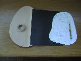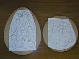 切った板の上に、描きたい絵の型を置きます。大きさを確認して納得するものを選びます。プロの作品は、下地を黒や白などに塗ってから転写しているようですが、私の場合何事も楽をするのが特徴ですから、直接絵を転写することにしています。 |