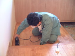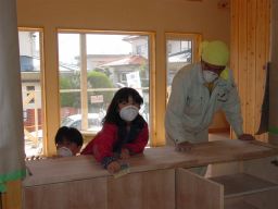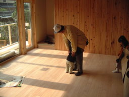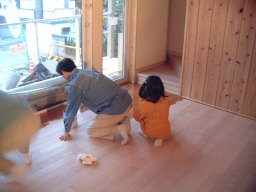 玄関からリビングの床は、多少のことでは へこまない硬いサクラにしました。 床は自分たちで磨き、塗料を塗りました。 写真は右から、江田君、やる気満々の私の娘、 そしてF君です。 |