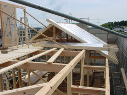 | 二階部にガルバニウム鋼板を張ります。 メンテナンスがかなり容易になるそうです。 |