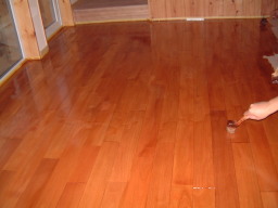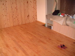| ぬって、磨いてを二度塗りをしましました。 できあがったばかりの、床です。 使用した塗料はリボスです。 現在生活し始めて半年が立ちましたが、 今は、少し色がなじんできて薄くなりました。 また、やってみたいですね。 |
