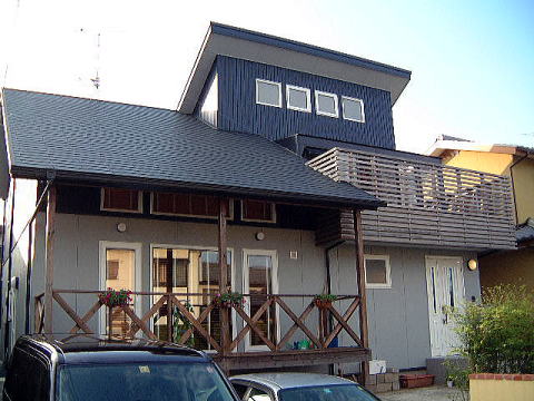 外観は、江田君と私の妻の、希望で二階部分がガルバニウム鋼鈑での仕上げになっています。