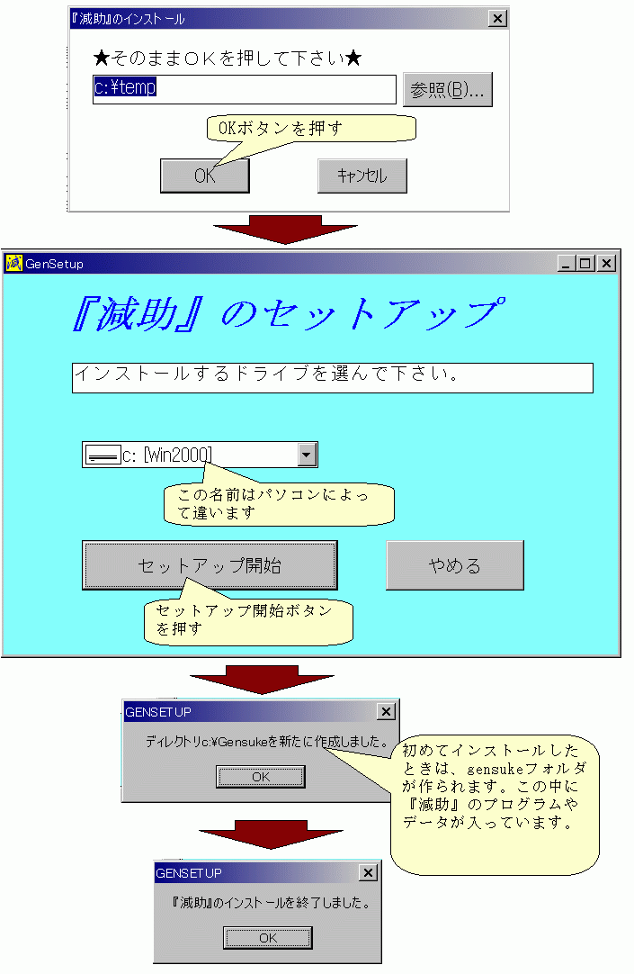 (3) C:\gensukeフォルダができて、この中に『減助』が入ります。