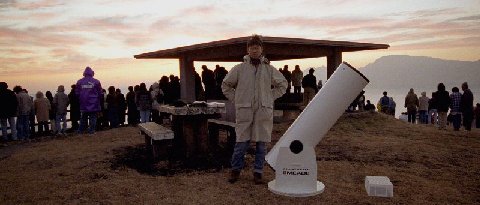 必死の思いでドブソニアンを展望所のところまで運び上げ、組立。月齢20の月が頭の上に輝いているので、そこに向けました。黙っていても、お客さんは向こうからやって来ないのでとりあえず、近くでふるえていた男1女3のグループに声をかけゲット。男の人からはカンコーヒをいただきました。あと、適当に声をかけお客さんを確保しました。